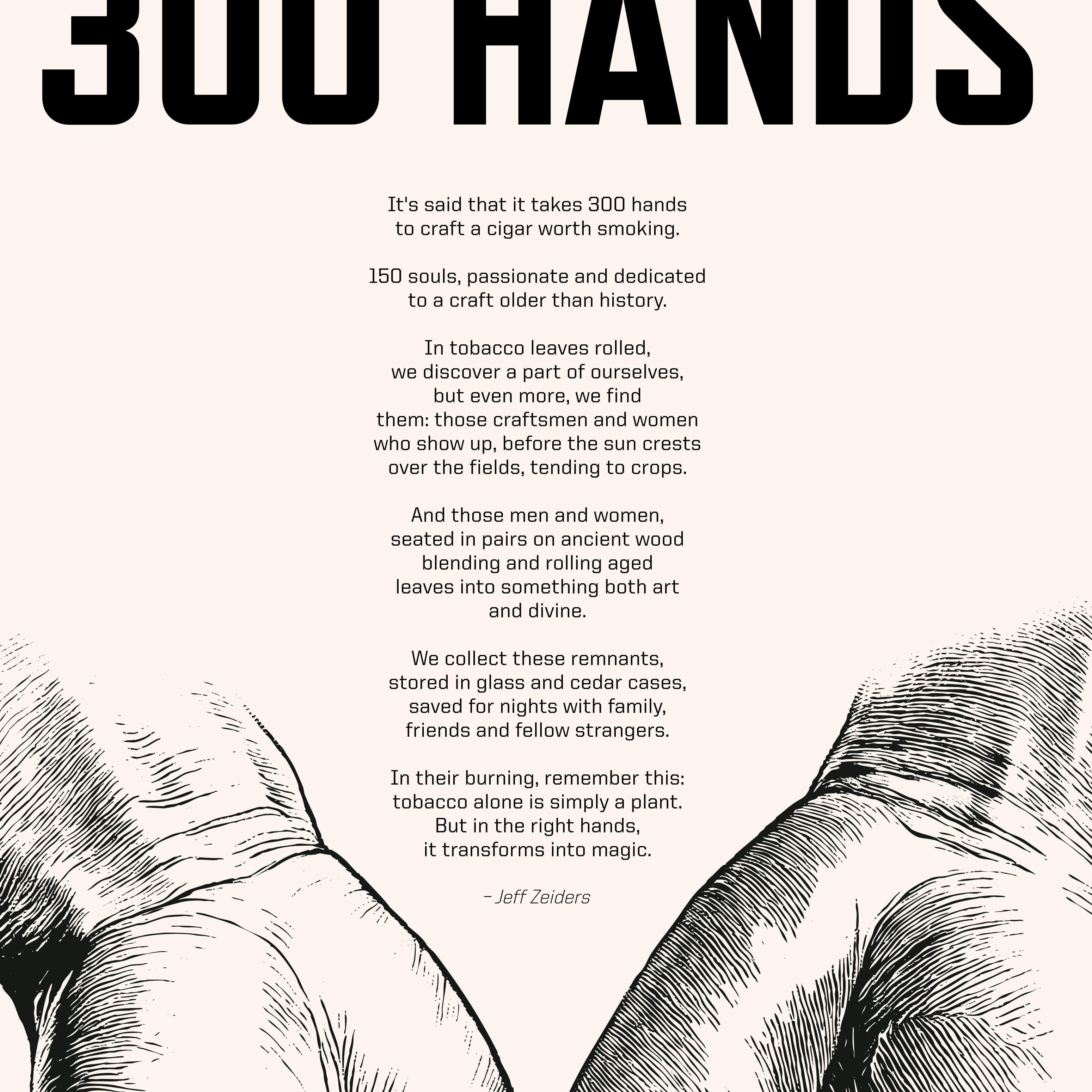 In the rugged landscape of tobacco fields, every cigar is born from the sweat and skill of countless hands. 300 Hands captures the weathered palms of a tobacco craftsman, an emblem of the labor and dedication it takes to bring a premium cigar from seed to smoke. Accompanied by an original poem by Jeff Zeiders, this piece honors the unsung artisans whose craftsmanship makes every cigar a masterpiece. Perfect for those who appreciate the art behind the craft.